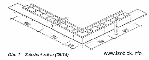 Vnější i vnitřní zdi s betonovým jádrem se provádějí současně. Přesnost uložení tvárnic se kontroluje vodováhou.