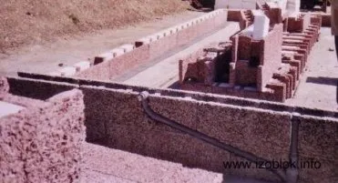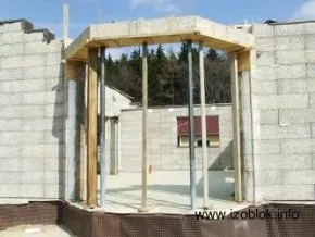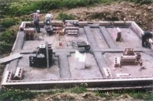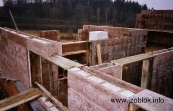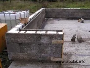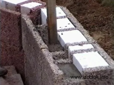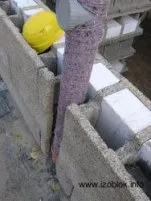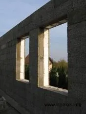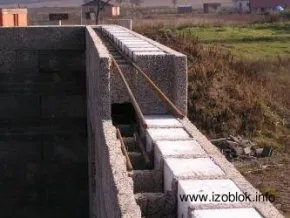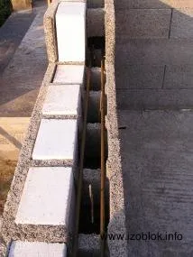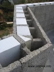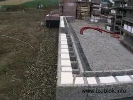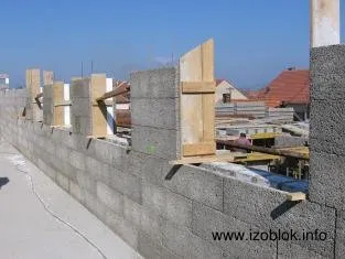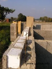 Vnější i vnitřní zdi s betonovým jádrem se provádějí současně. Přesnost uložení tvárnic se kontroluje vodováhou.