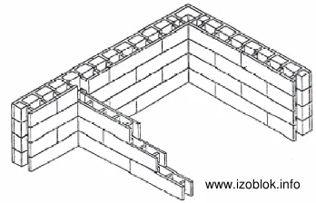 a) Vyříznutím vnitřní stěny tvárnice vnější zdi na šířku vnitřní zdi a vložení vnitřní tvárnice 4 cm do obvodové tvárnice.